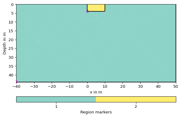 Points with the physical number 99 are interpreted as sensors. Note that physical point groups are ordered with respect to the node tag. E.g. “Physical Point (99) = {50, 34};” and “Physical Point (99) = {34, 50};” will yield the same mesh. This must be taken into account when defining measurement configurations using electrodes defined in GMSH using marker 99.