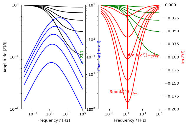 >>> import numpy as np >>> import pygimli as pg >>> from pygimli.physics.SIP import modelColeColeRho >>> f = np.logspace(-2, 5, 100) >>> m = np.linspace(0.1, 0.9, 5) >>> tau = 0.01 >>> fImMin = 1/(tau*2*np.pi) >>> fig, axs = pg.plt.subplots(1, 2) >>> ax1 = axs[0] >>> ax2 = axs[0].twinx() >>> ax3 = axs[1] >>> ax4 = axs[1].twinx() >>> for i in range(len(m)): ... Z = modelColeColeRho(f, rho=1, m=m[i], tau=tau, c=0.5) ... _= ax1.loglog(f, np.abs(Z), color='black') ... _= ax2.loglog(f, -np.angle(Z)*1000, color='b') ... _= ax3.loglog(f, Z.real, color='g') ... _= ax4.semilogx(f, Z.imag, color='r') ... _= ax4.plot([fImMin, fImMin], [-0.2, 0.], color='r') >>> _ = ax4.text(fImMin, -0.1, r"$f($min($Z''$))=$\frac{1}{2*\pi\tau}$", color='r') >>> _ = ax4.text(0.1, -0.17, r"$f($min[$Z''$])=$\frac{1}{2\pi\tau}$", color='r') >>> _ = ax1.set_ylabel('Amplitude $|Z(f)|$', color='black') >>> _ = ax1.set_xlabel('Frequency $f$ [Hz]') >>> _ = ax1.set_ylim(1e-2, 1) >>> _ = ax2.set_ylabel(r'- Phase $\varphi$ [mrad]', color='b') >>> _ = ax2.set_ylim(1, 1e3) >>> _ = ax3.set_ylabel('re $Z(f)$', color='g') >>> _ = ax4.set_ylabel('im $Z(f)$', color='r') >>> _ = ax3.set_xlabel('Frequency $f$ [Hz]') >>> _ = ax3.set_ylim(1e-2, 1) >>> _ = ax4.set_ylim(-0.2, 0) >>> pg.plt.show()